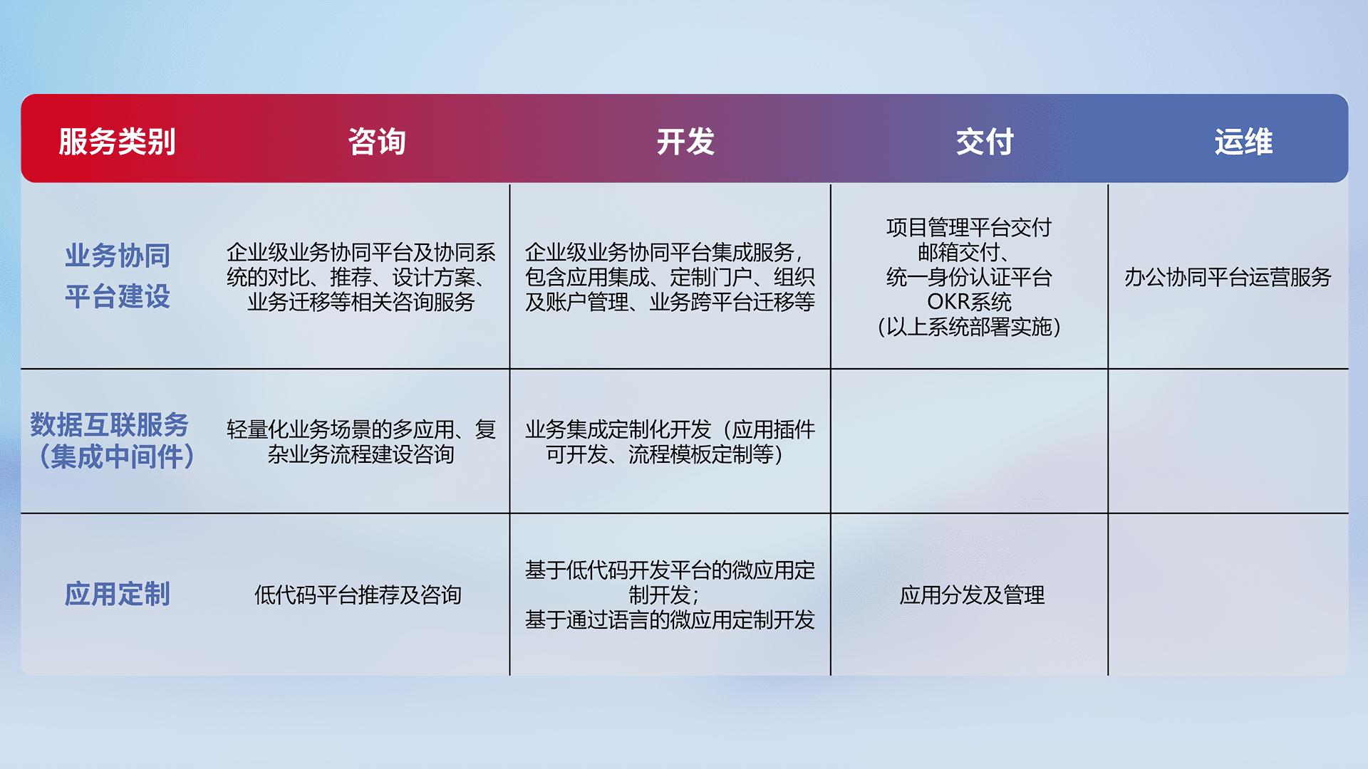 针对钉钉、、企微、、、IDaas等平台级产品提供产品的规划、、方案、、、、交付、、、定制化开发等服务,,,实现如统一协同办公、、智能客户服务、、、混合会议管理、、、智能数据查询、、、等业务场景,,,,实现数字化转型。。。。